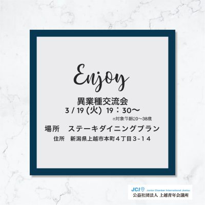 公益社団法人上越青年会議所では「異業種交流会」を実施致します。上越市内の企業における様々な業種の方が集い、意見交換や同世代の話題、悩みを共有する場となると考えております。ぜひご参加、お待ちしてます。